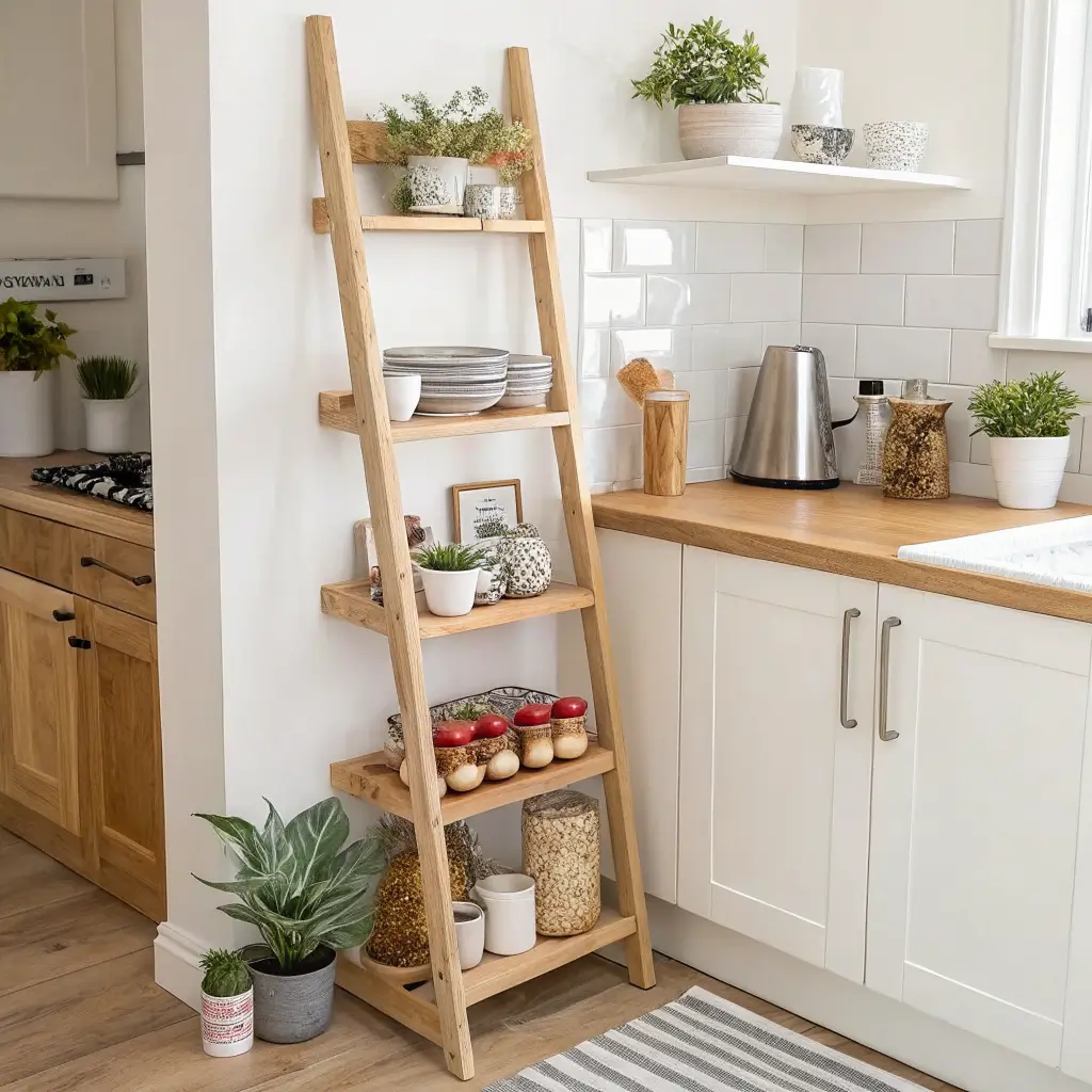 Who decided ladders were just for climbing? Ladder-style shelves lean against your wall and give you instant storage with zero commitment. I bought one on a whim last year, and now I can’t imagine my kitchen without it.