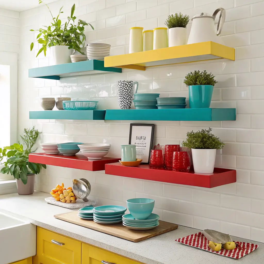 Who says kitchen shelves have to be boring? Colorful floating accent shelves inject personality and fun into your space. I painted mine bright yellow (I know, bold choice), and they make me smile every morning.