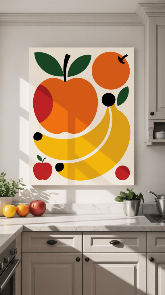 - Choose Your Vibe: What’s your kitchen’s personality? A vibrant, abstract painting can add insane energy. A modern, graphic print feels sleek and cool. A classic food-themed piece (like a giant, moody painting of an lemon) is both thematic and chic.