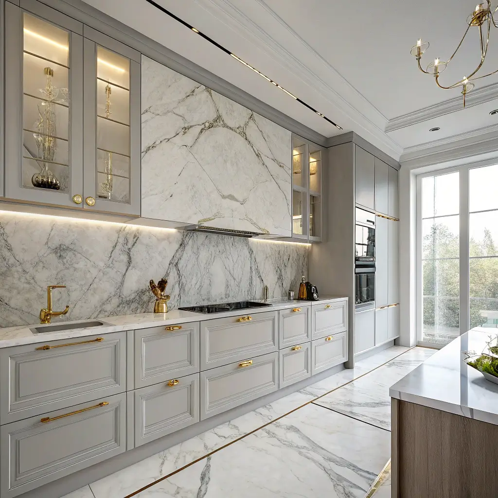 Okay, if you really want to go all out and make people’s jaws drop, nothing beats a full-height marble statement wall. I’m talking floor-to-ceiling marble magnificence that transforms your kitchen into something straight out of a luxury magazine.