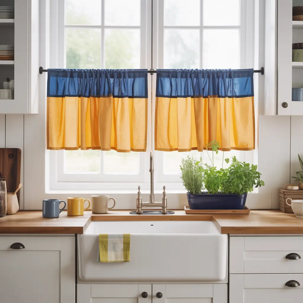 Color-blocking takes basic curtains from boring to bold with strategic use of contrasting colors. Picture this: navy bottom half, white top half, maybe a stripe of yellow in between. Suddenly your kitchen window looks like modern art.
