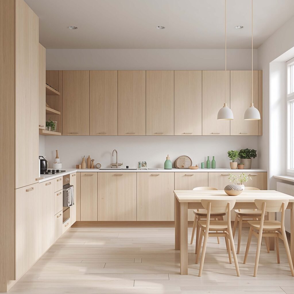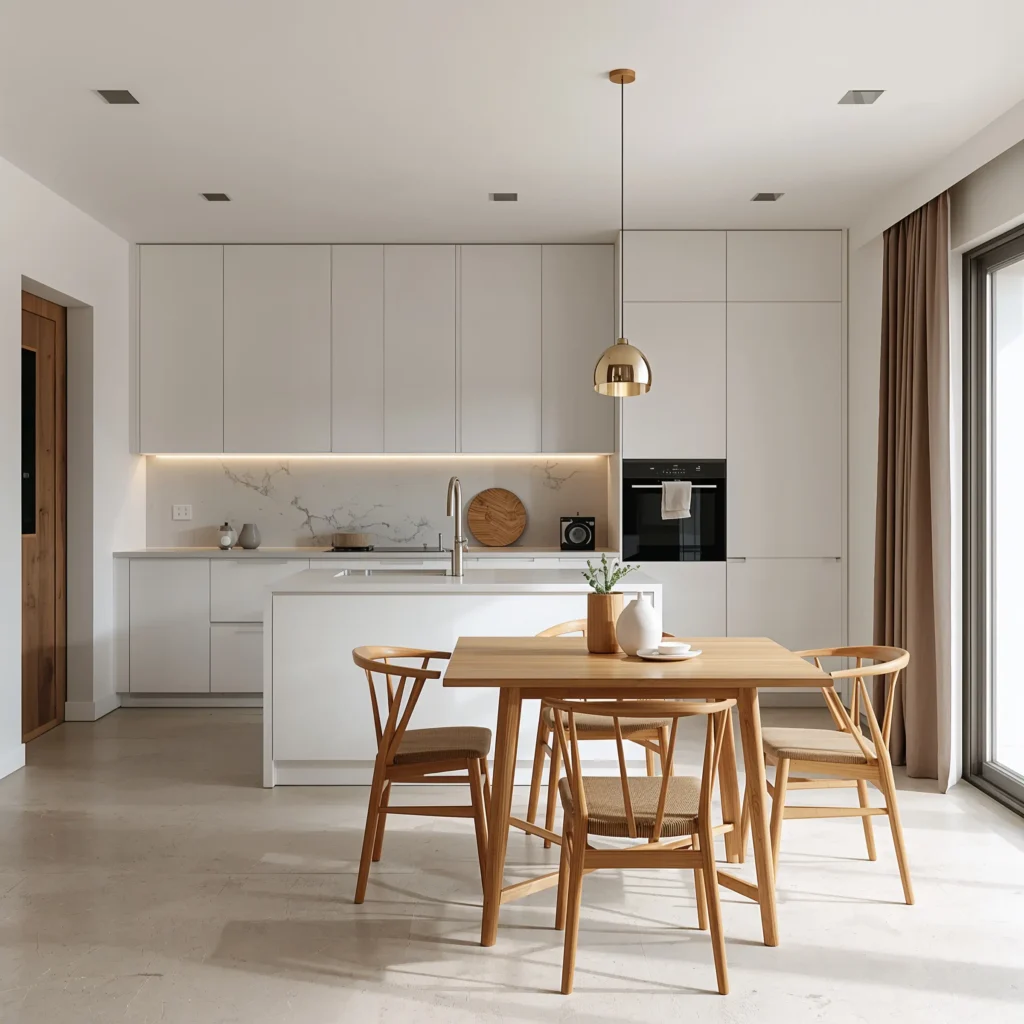 Start with light oak or birch everything. Your dining table, chairs, and even some cabinet fronts should feature this warm, honey-toned wood. But don’t go overboard—balance is crucial.