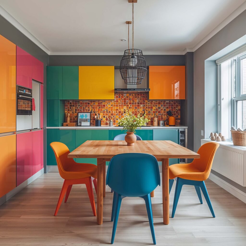 Don’t forget your kitchen backsplash—this can echo your chair colors and tie everything together. Maybe throw in some colorful bar stools or a painted island for good measure. FYI, once you go colorful, beige feels like punishment :/