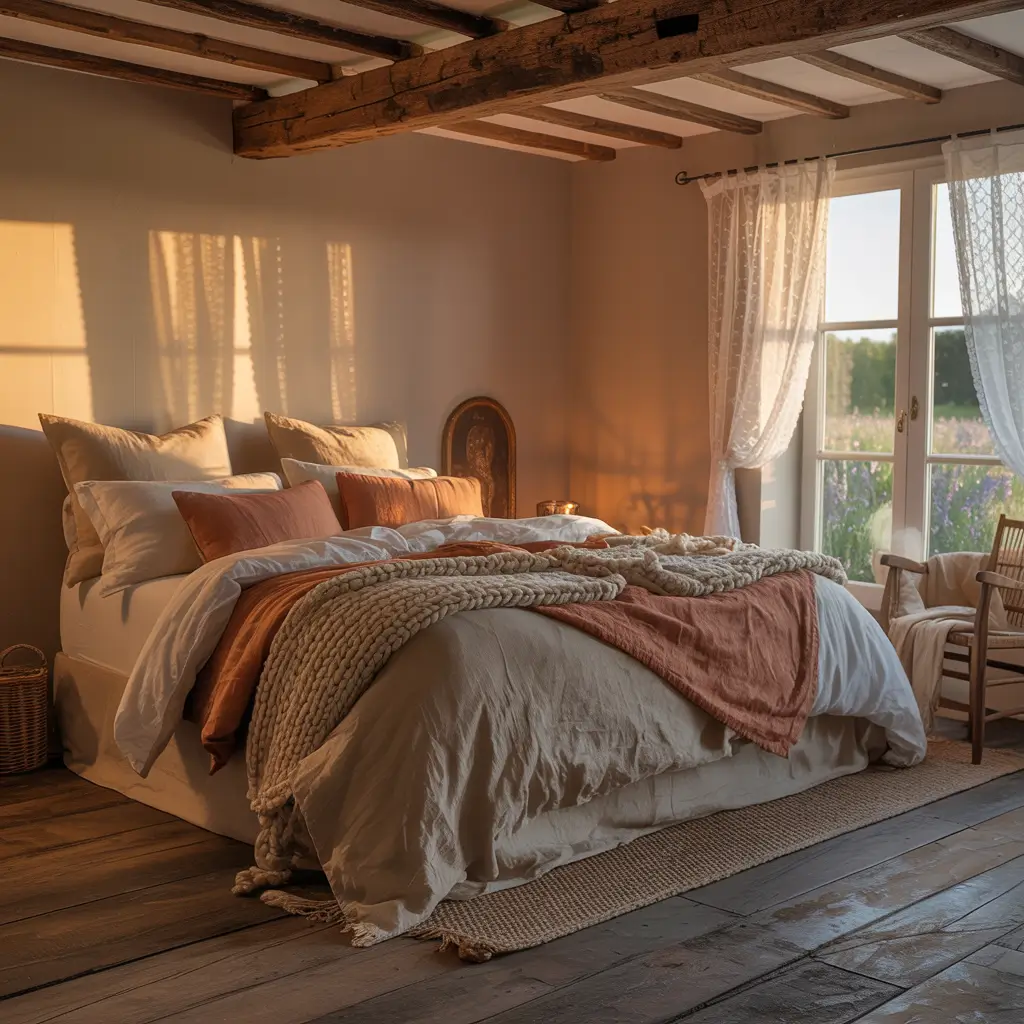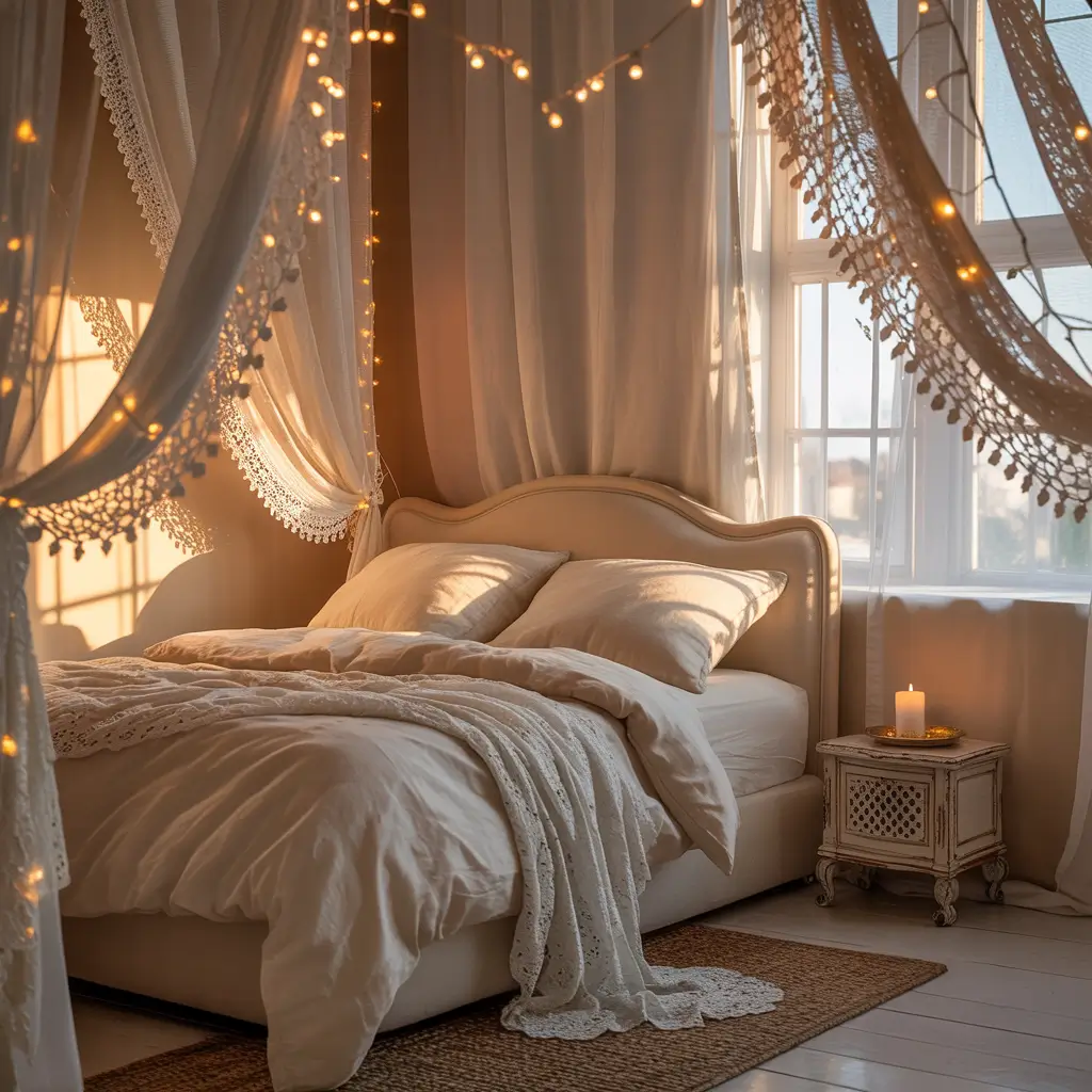 The trick is layering textures throughout the room. Think chunky knit throws, silk pillowcases, and maybe a furry rug beside the bed. The lace curtains tie everything together without competing for attention.