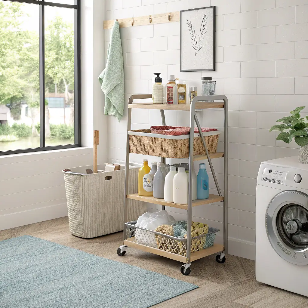 Who decided storage had to be stationary? Not me. I bought a three-tier rolling cart from that Swedish furniture store (you know the one), and it revolutionized my laundry routine.