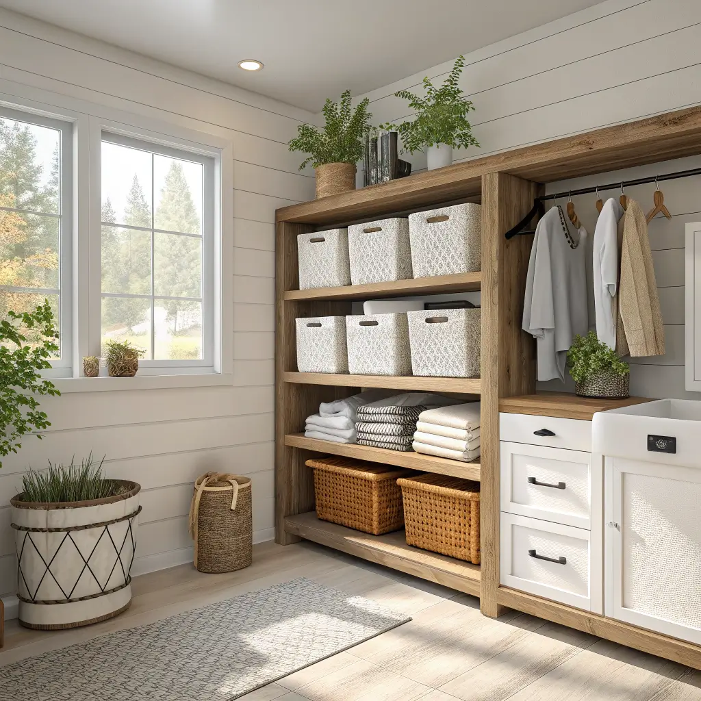 Open shelving scared me at first. Wouldn’t everything look cluttered? Turns out, with the right bins and baskets, open shelving actually makes your laundry room look bigger and more organized.