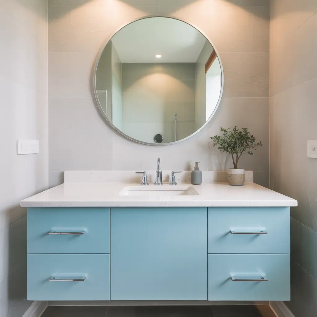 Floating vanities in light blue look especially modern. They make floor cleaning easier (huge plus) and create that airy feeling everyone’s after. Pair with a white countertop and you’re golden.