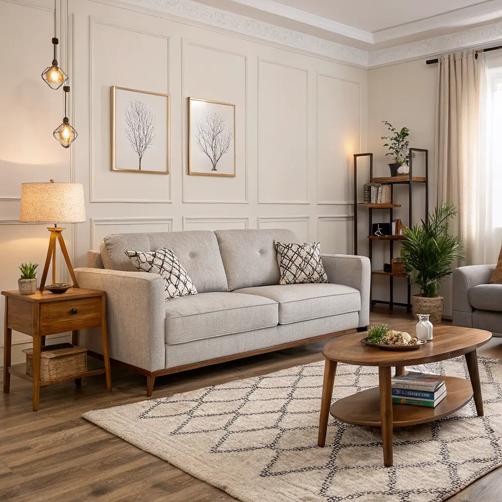 Start with your grey sofa as the anchor piece. Pair it with a simple white or light wood coffee table – something with clean lines and zero fuss. I personally love a rectangular glass-top table with slim metal legs. It practically disappears visually while still being functional.