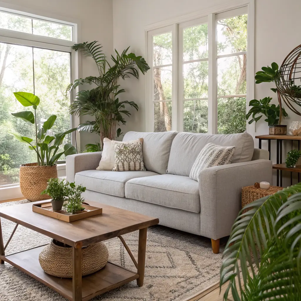 Create levels with your plant display. Mix floor plants, table plants, and hanging plants for a layered, jungle-like feel. Your grey sofa provides a neutral backdrop that lets all that green really pop.