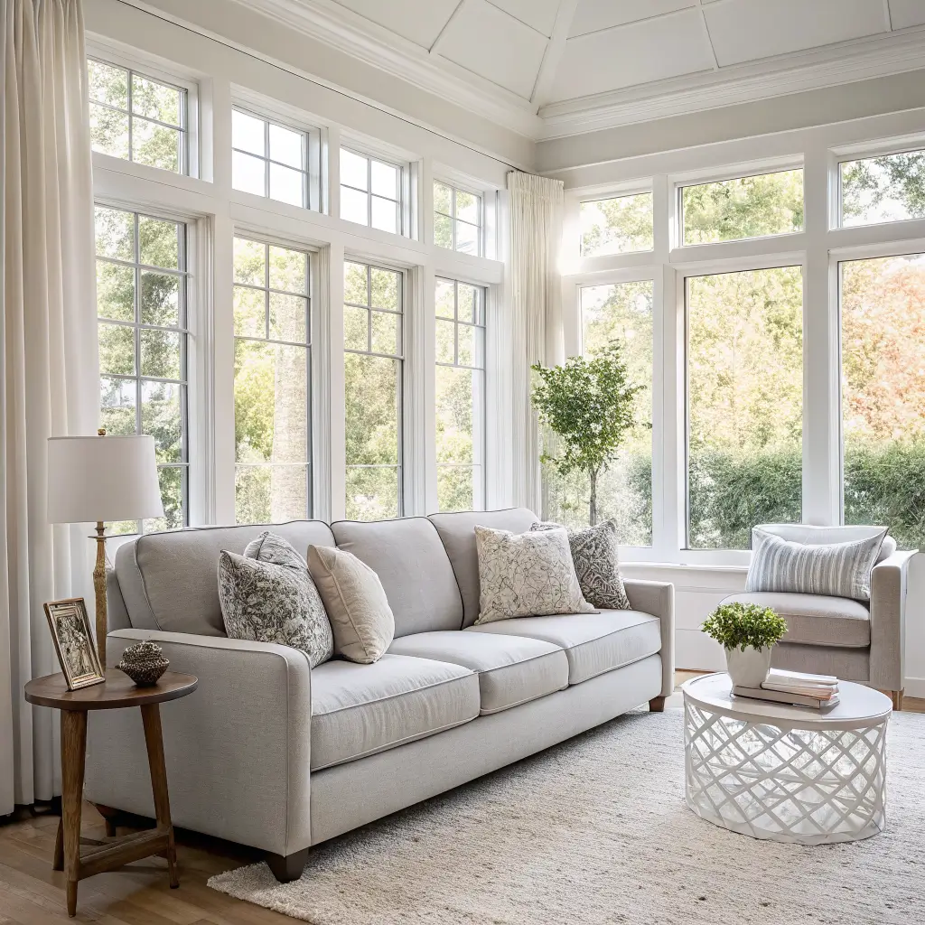 First rule: keep everything else light and bright. White walls, light flooring, and minimal window treatments let natural light bounce around the room. Your grey sofa won’t visually weigh down the space like a dark couch would.