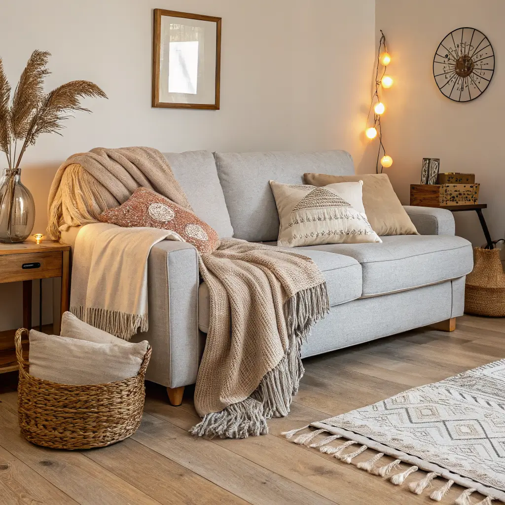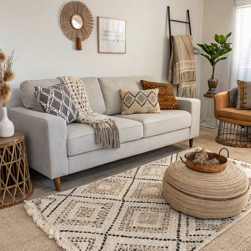 Want to create a space that feels like a warm hug? The cozy neutral approach with a light grey sofa is your answer. This is where texture becomes your best friend.