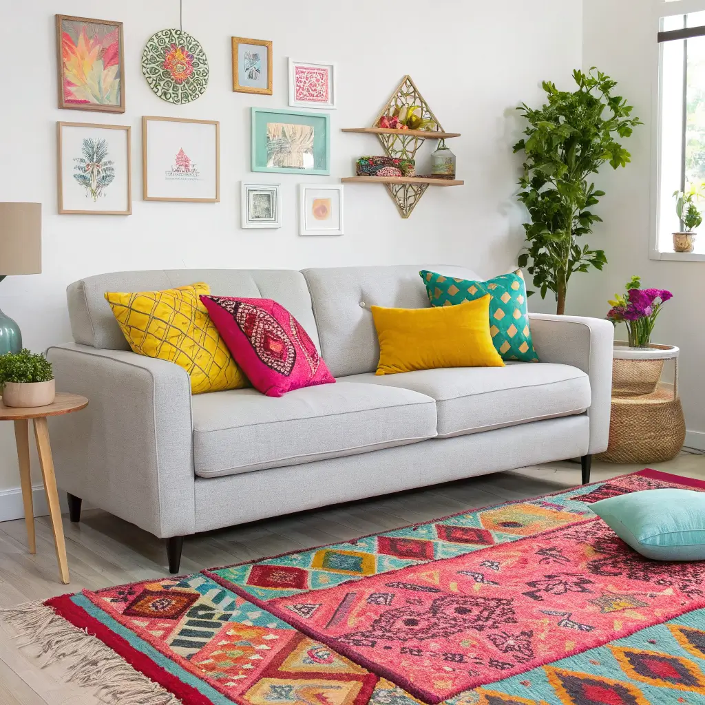 The 60-30-10 rule is your friend here. That’s 60% neutral (your grey couch and walls), 30% secondary color (maybe a rug or curtains), and 10% bold accent (pillows, artwork, accessories). This formula keeps things balanced while still letting you play with color.