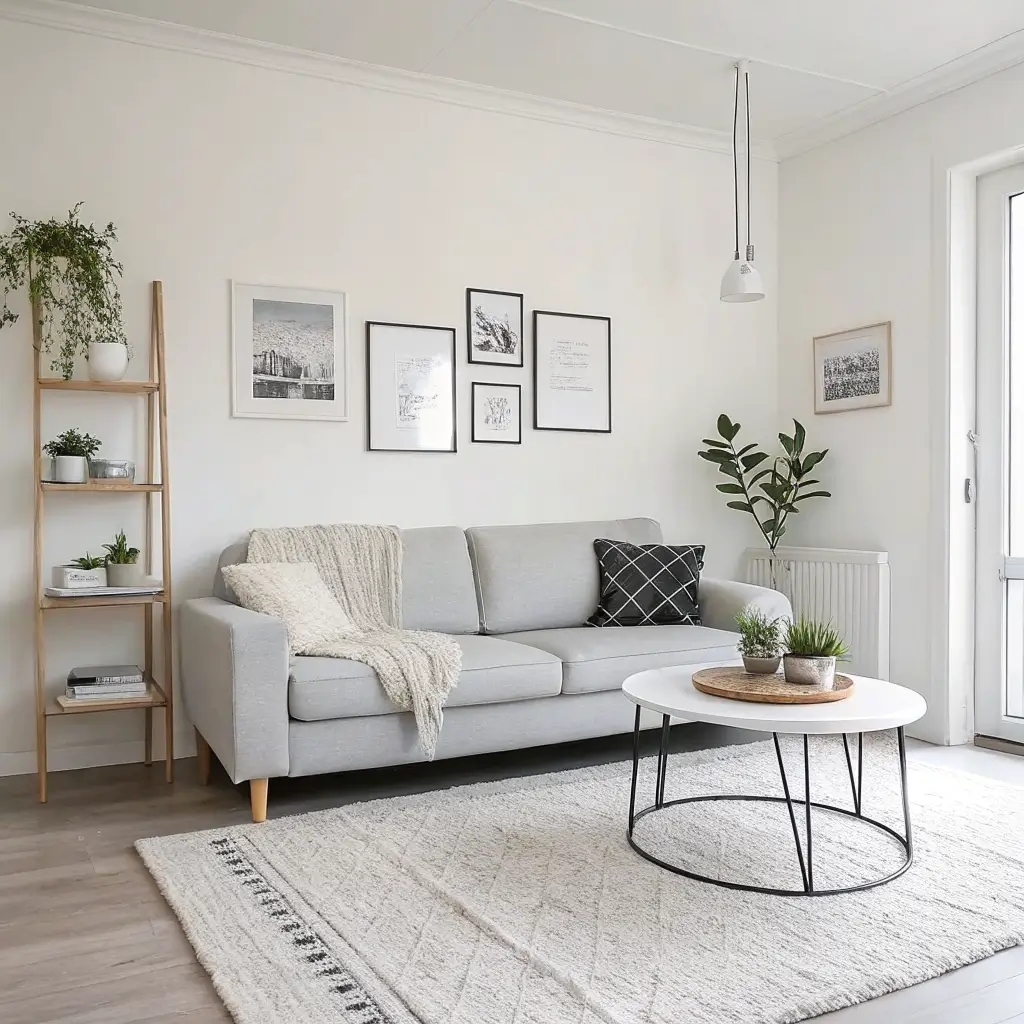 Keep your color palette light and airy. Your grey couch already does the heavy lifting – everything else should feel weightless. Think white walls, light wood tones, and maybe one accent color used sparingly throughout.