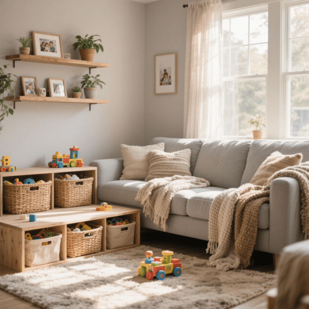 Create zones within your living room – maybe a reading corner with floor cushions, or a designated toy area that can be quickly tidied. Your grey couch anchors the adult space while still being kid-friendly. Win-win!