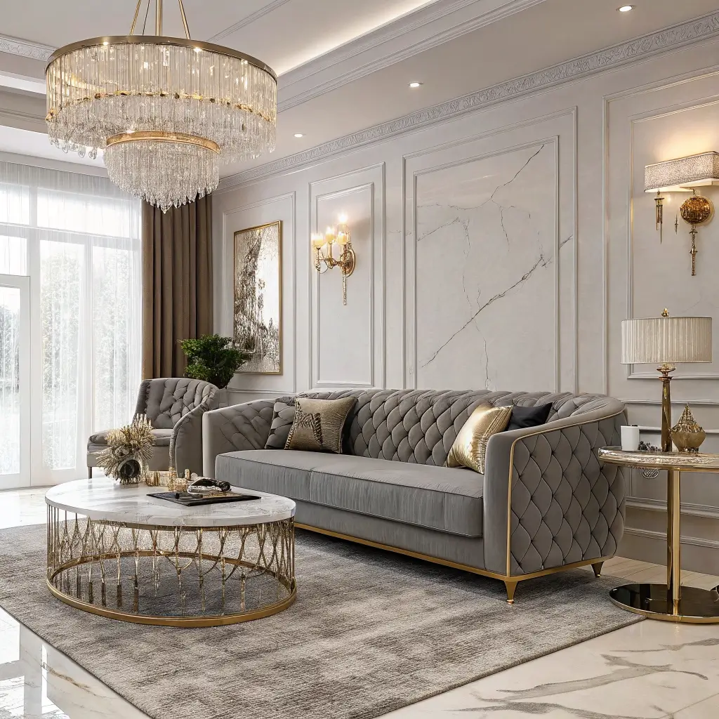 Luxurious Living Room with Grey Velvet Sofa