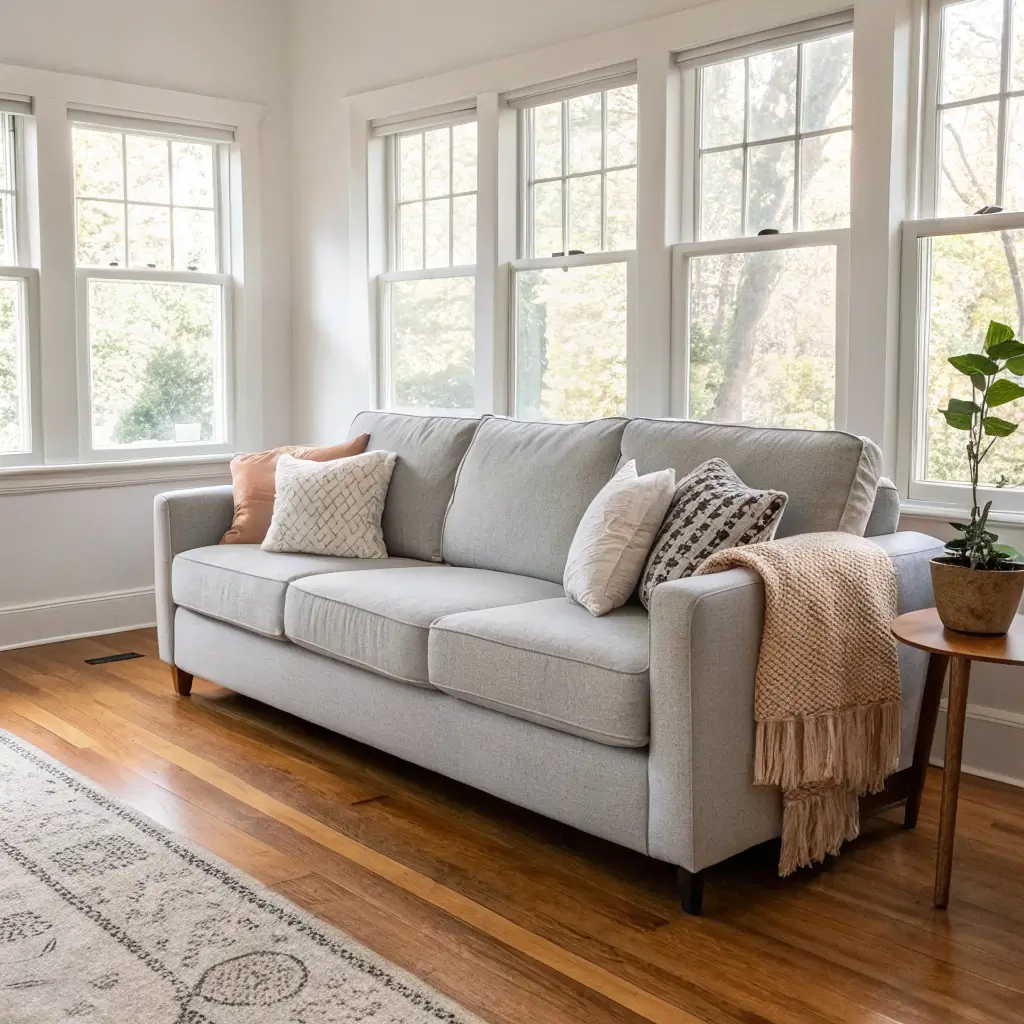 Living in 500 square feet? Join the club! Small spaces actually benefit MORE from light grey sofas than larger ones. Why? Grey doesn’t visually dominate like darker colors do.