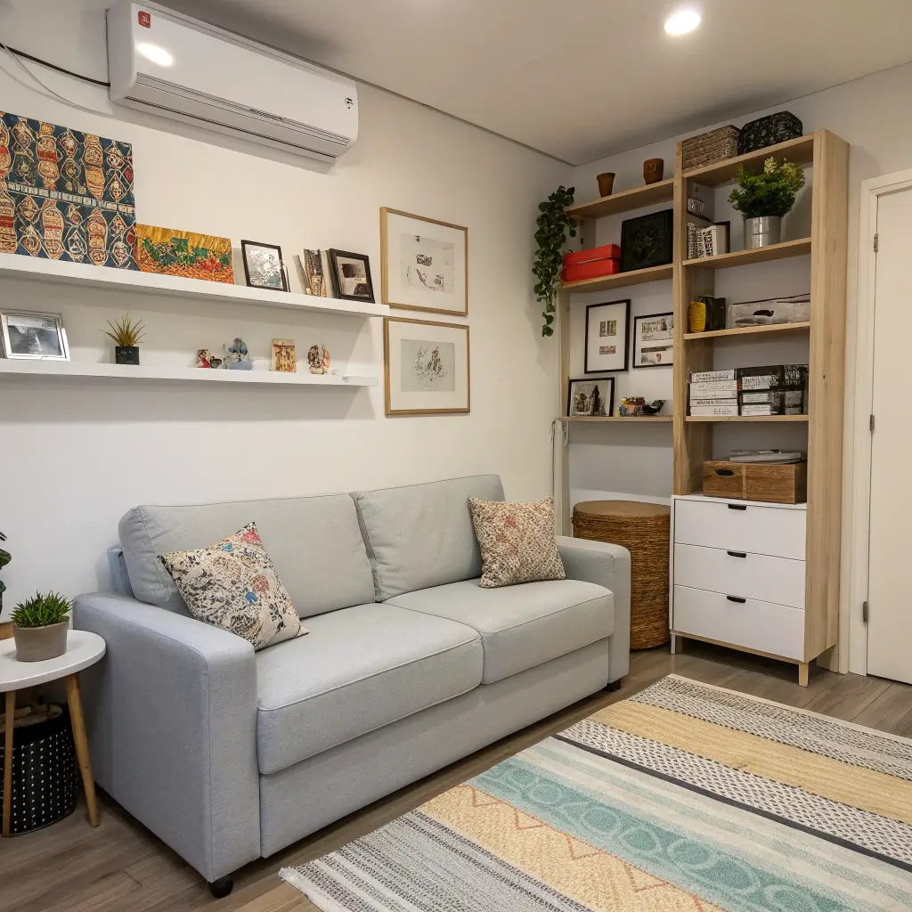 First hack: float your sofa away from the wall. I know, sounds counterintuitive, but creating a tiny walkway behind it actually makes the room feel larger. Use that space for a narrow console table – boom, extra storage and surface area.