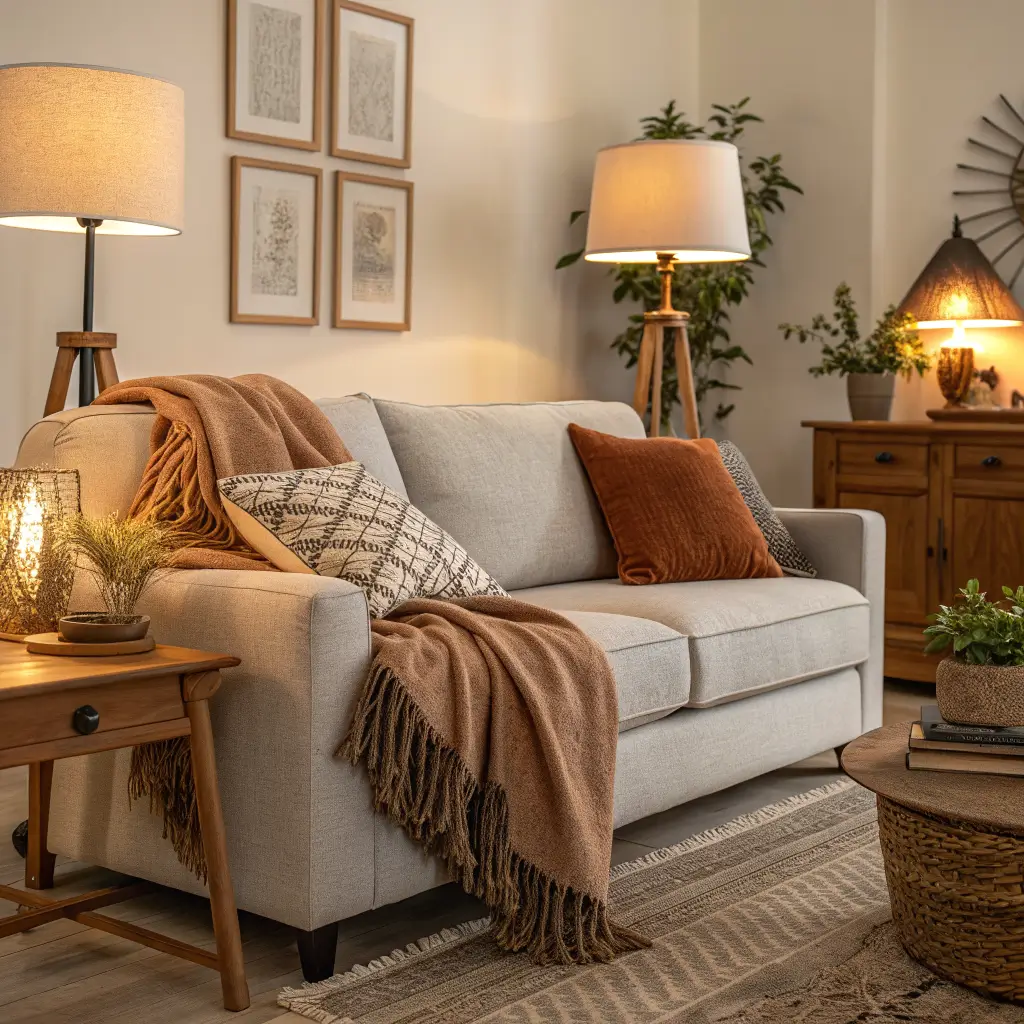 Choose warm-toned accessories: rust orange pillows, terracotta planters, honey-colored wood furniture. Layer in soft lighting with table lamps, floor lamps, and maybe some string lights if you’re feeling festive. The goal? Making people want to curl up with a book and never leave.
