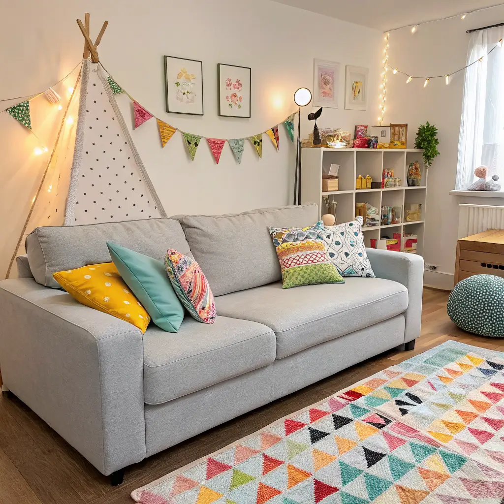 Create zones within your living room: a play corner with stylish storage baskets, a reading nook with floor cushions, and the main seating area for family movie nights. Your grey sofa anchors the adult space while coexisting peacefully with kid-friendly elements.