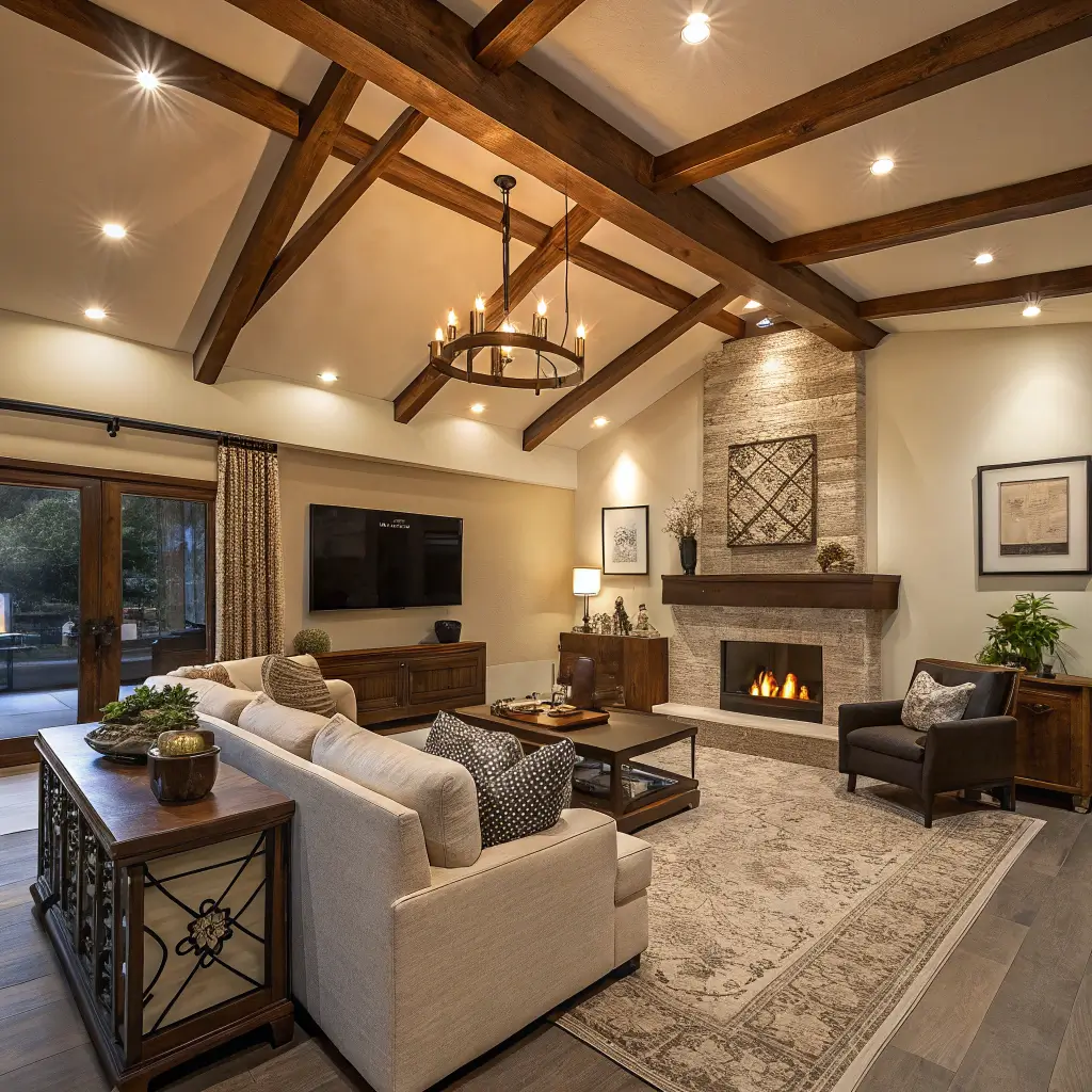 Pro tip: Mix wooden beams with white ceiling space for that perfect modern-meets-rustic balance. And please, for the love of good design, make sure your beams run parallel to your longest wall. Random beam placement is not artistic – it’s chaotic.