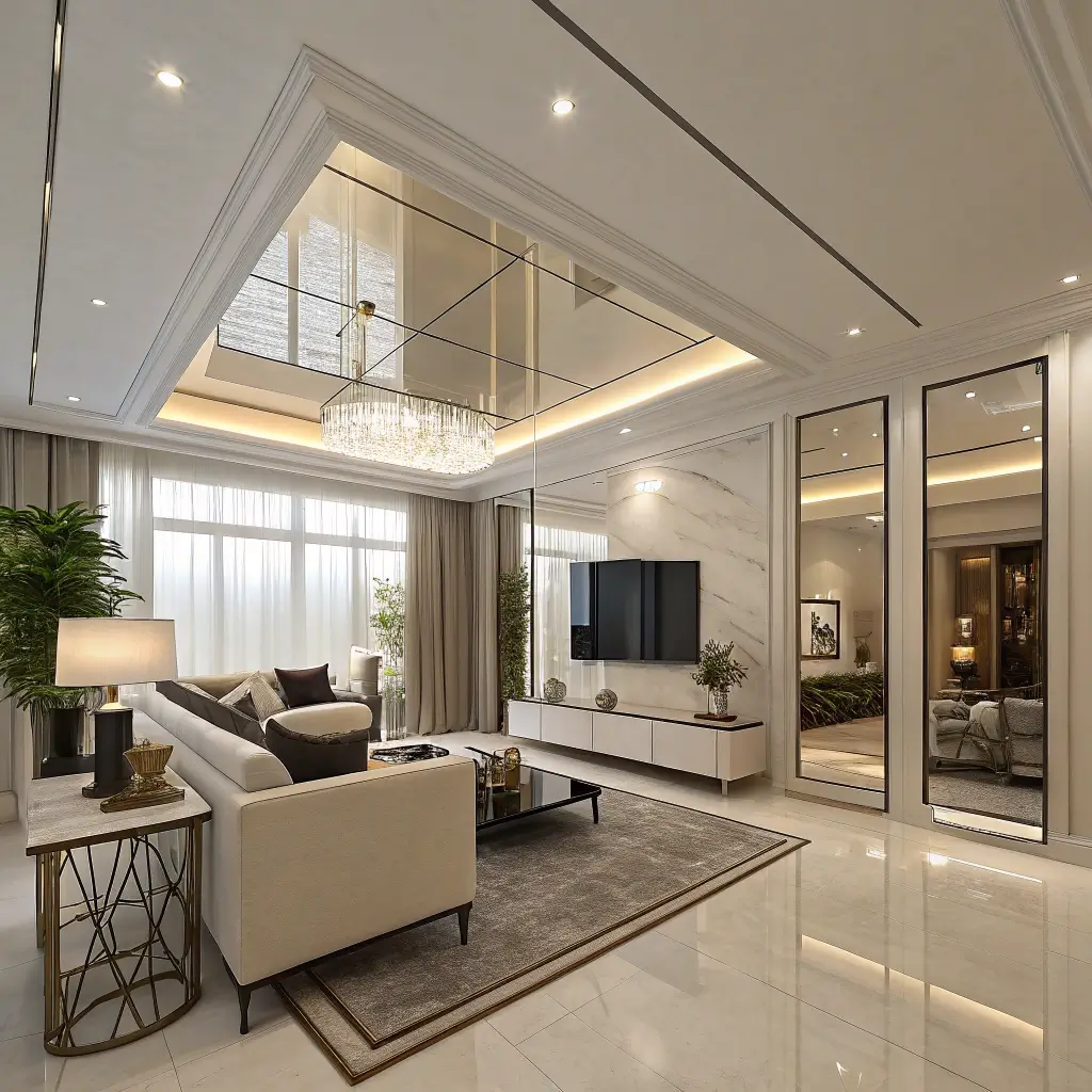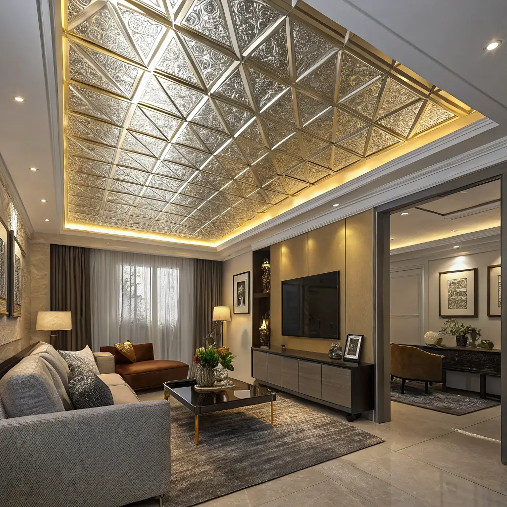 Okay, hear me out before you think this is too much. Mirror panel ceilings (when done tastefully) can make your living room feel twice its actual size. We’re not talking full mirrors – think antiqued, tinted, or textured mirror panels that reflect light without the fun house effect.