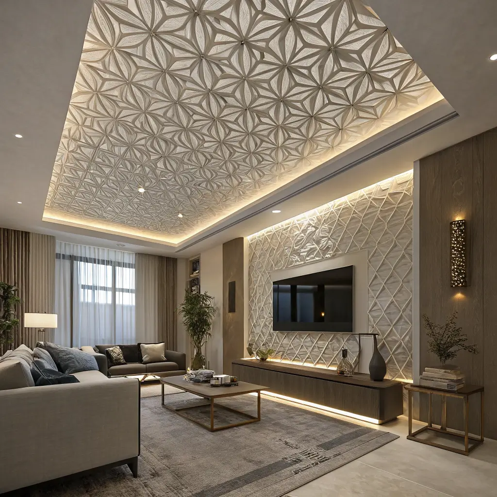 This design trend takes the concept of accent walls and extends it onto the ceiling, creating seamless 3D patterns that flow from vertical to horizontal surfaces. The effect is absolutely stunning and makes traditional ceiling designs look boring by comparison.