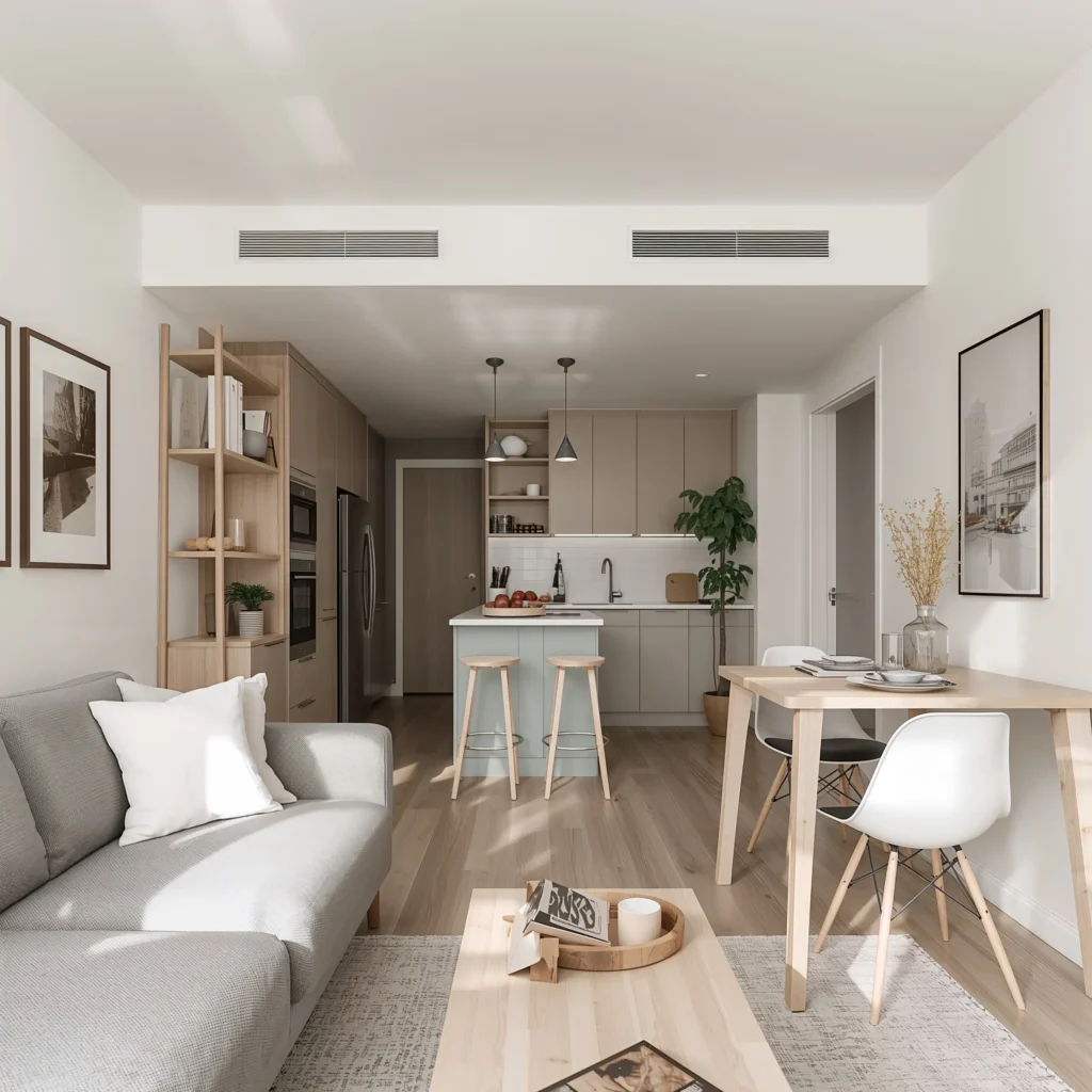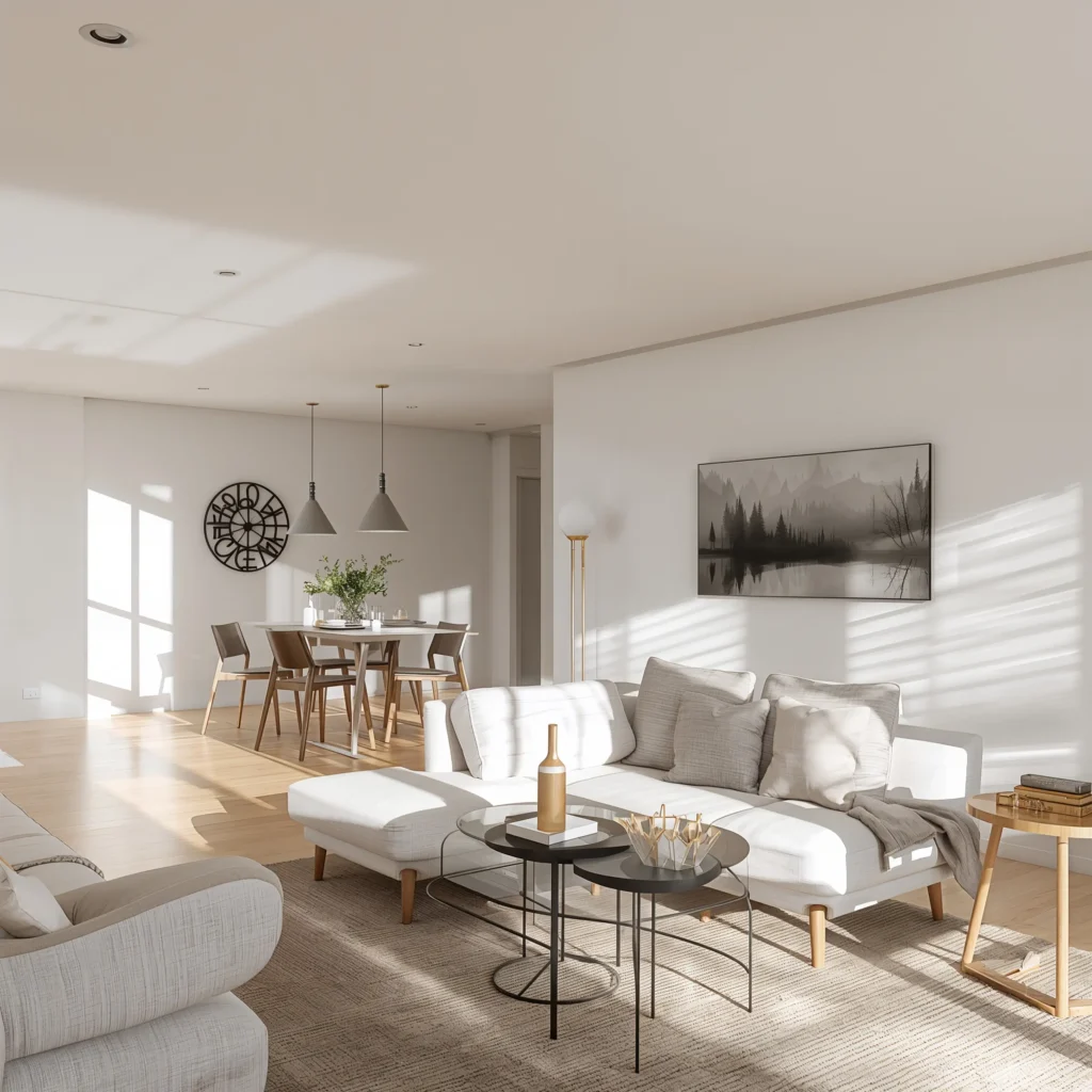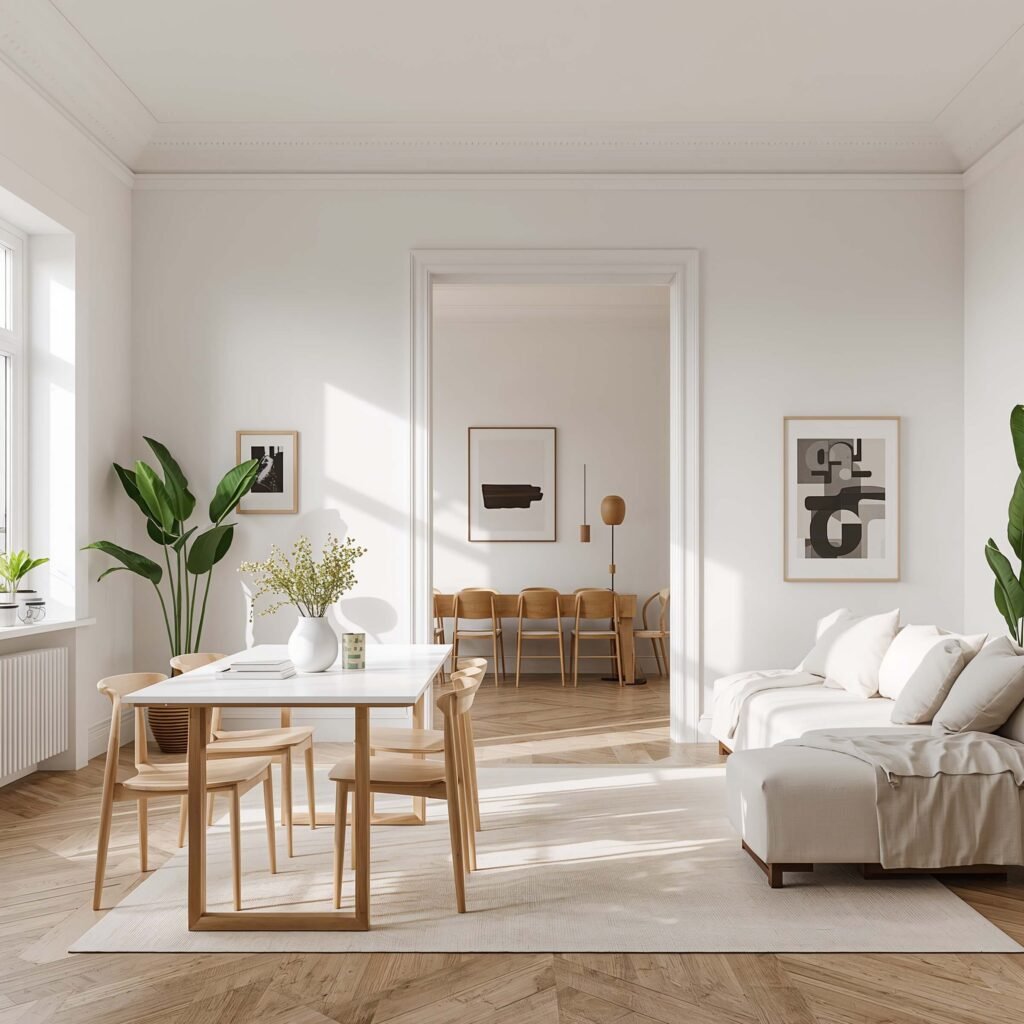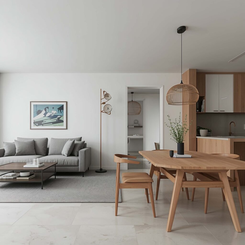 Start with a white or light gray base for walls and major furniture pieces. Add warmth through natural wood tones – think light oak or birch. The dining table should be simple, maybe with tapered legs, while your living room furniture stays low and inviting.