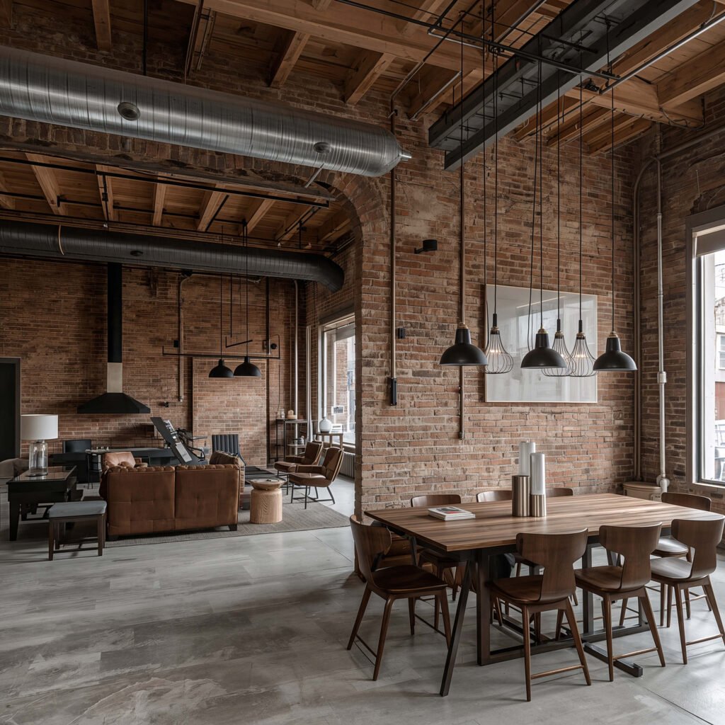 Raw materials and exposed elements define industrial style. Think exposed brick (real or faux), visible ductwork, and concrete floors. But here’s the thing – you need to warm it up, or you’ll feel like you’re living in an actual factory.