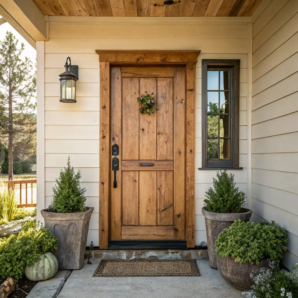 Reclaimed wood tops my list every time. Why? Because it comes pre-weathered with authentic character you can’t fake. Pine gives you that classic cabin feel without breaking the bank. Oak brings serious durability and those gorgeous grain patterns. And if you’re feeling fancy, walnut creates this rich, chocolate-brown entrance that screams luxury ranch.