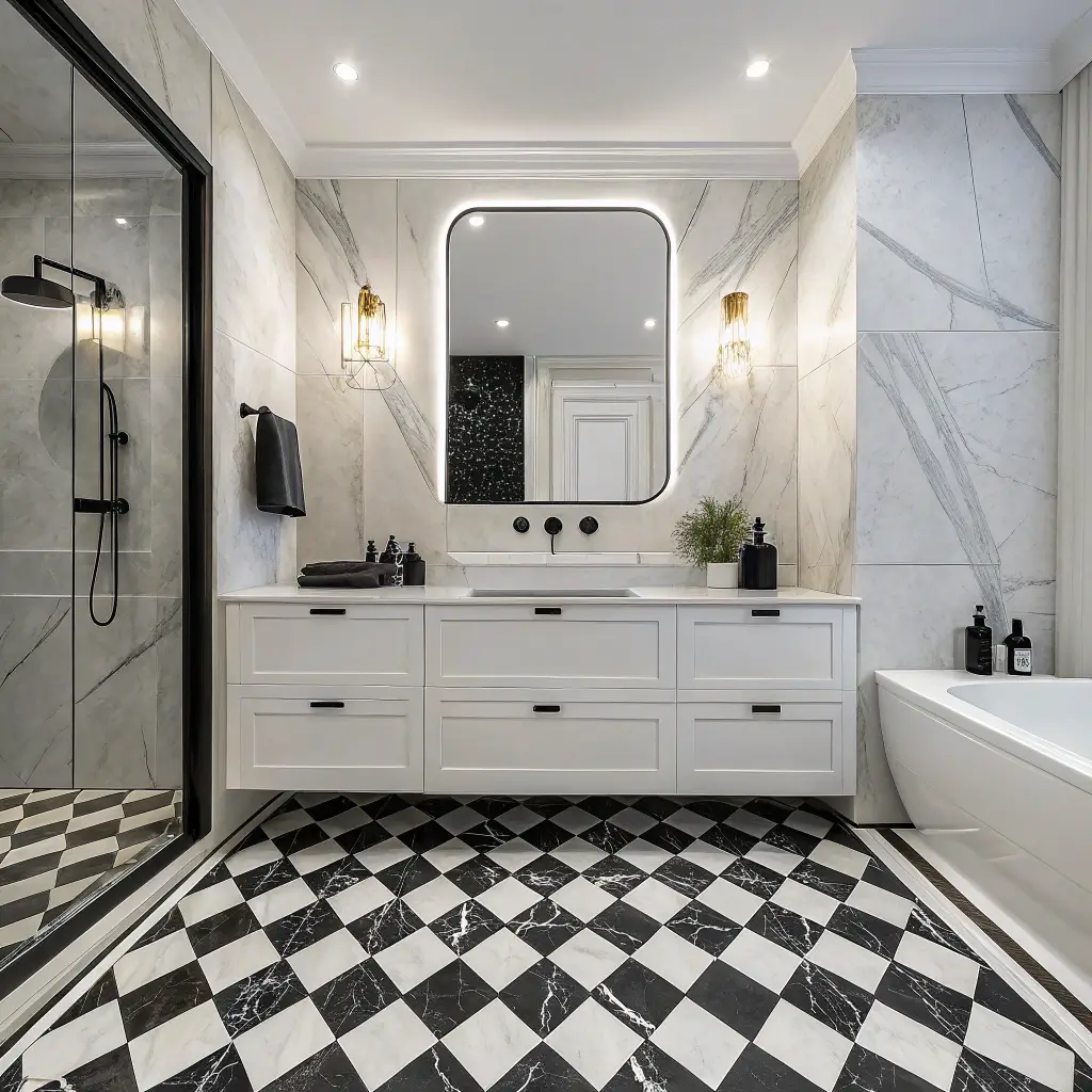 Here’s my pro tip: keep everything else simple when you go checkerboard. White walls, minimal décor, maybe a pop of gold in your fixtures. The floor is your statement piece – don’t compete with it.