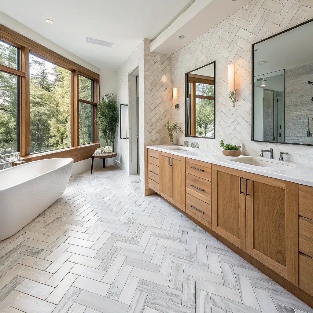 Herringbone makes everything look expensive. Period. I don’t make the rules; that’s just how it works. This classic pattern brings instant sophistication to any bathroom, whether you’re working with a tiny powder room or a sprawling master suite.