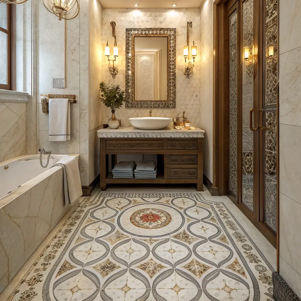 Mosaic marble floors bring this incredible textural element that larger tiles just can’t match. Whether you go with penny rounds, arabesque shapes, or geometric patterns, mosaics add personality and movement to your bathroom floor.