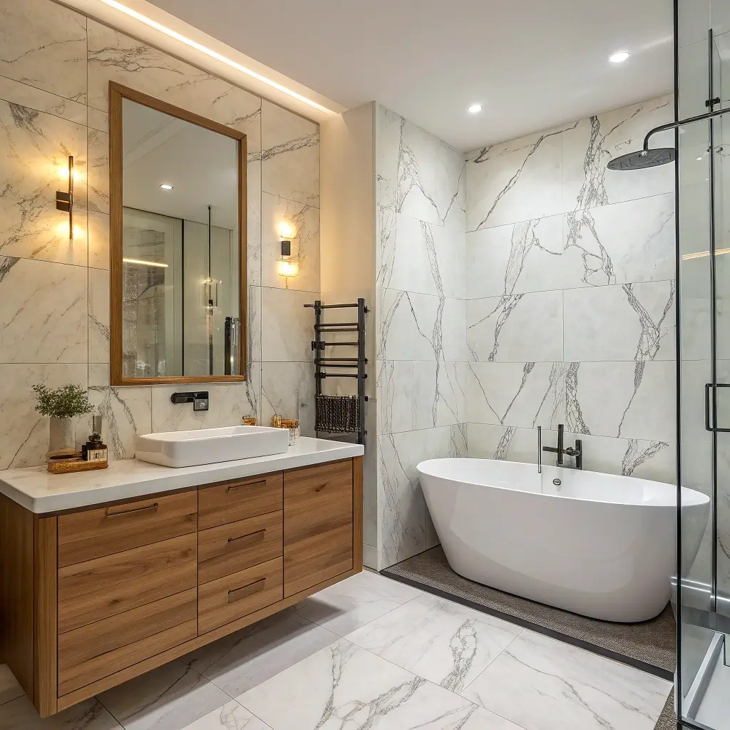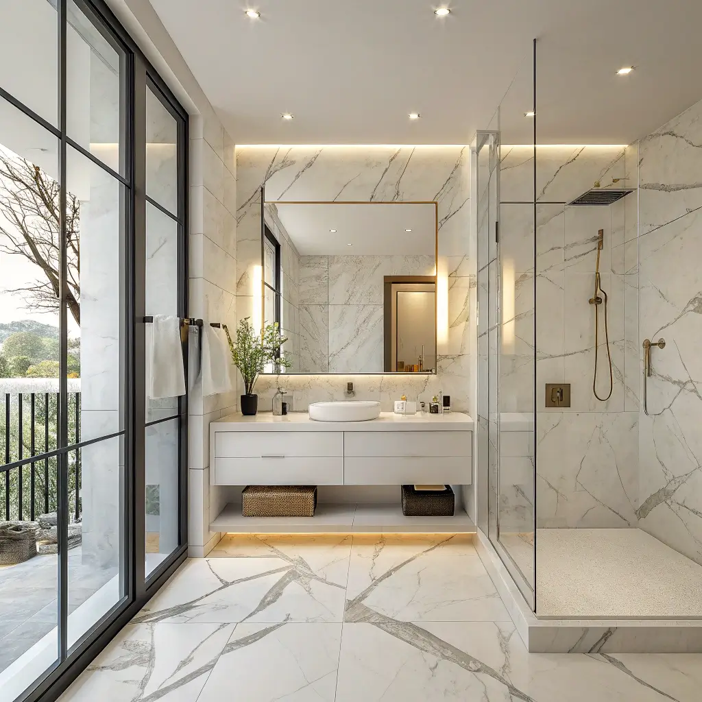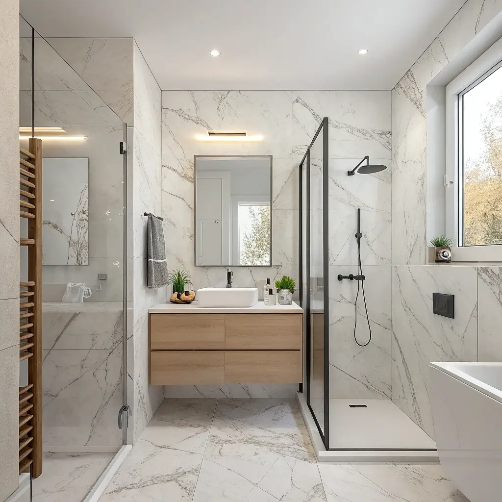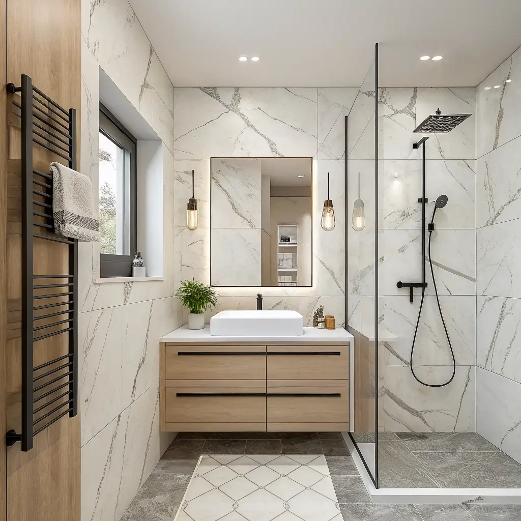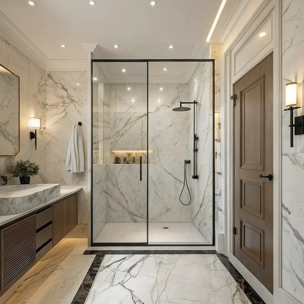 Let’s talk shower walls – because this is where marble really gets to show off. Full-height marble shower walls transform your daily rinse into a luxury experience. But which pattern should you choose?