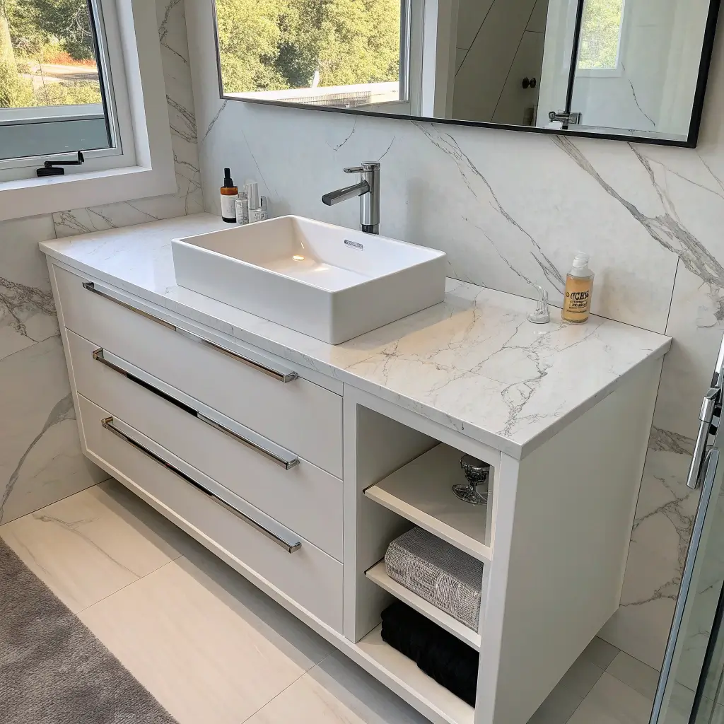 Want to know a secret? My kids’ bathroom has a marble-look quartz countertop. Looks identical to real marble but handles toothpaste spills and hair dye experiments like a champ. Sometimes being practical beats being a purist 😉