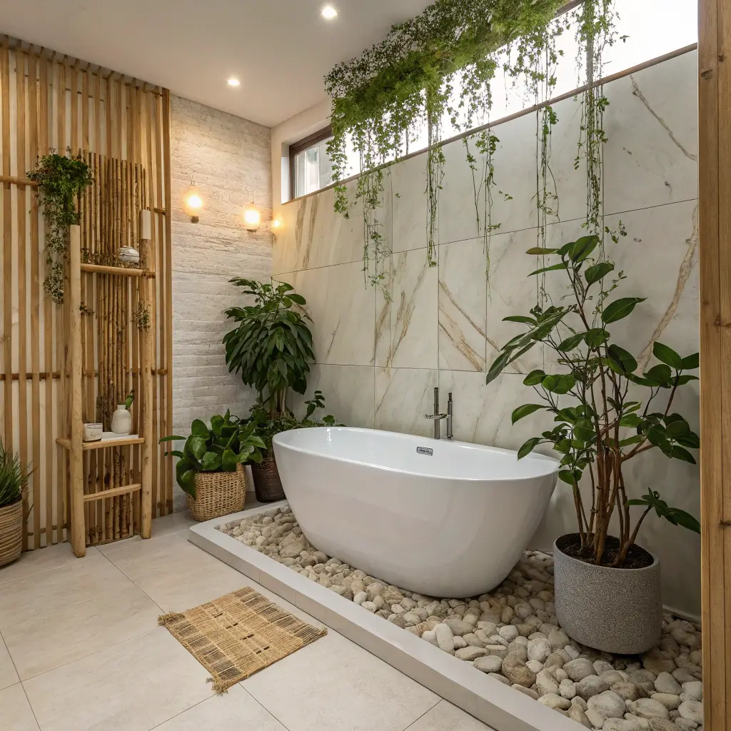 I transformed my master bath into a spa sanctuary with white marble floors, teak shower bench, and eucalyptus plants. Add some fluffy white towels and essential oil diffuser? Instant spa mode. My morning routine went from rushed to ritual.