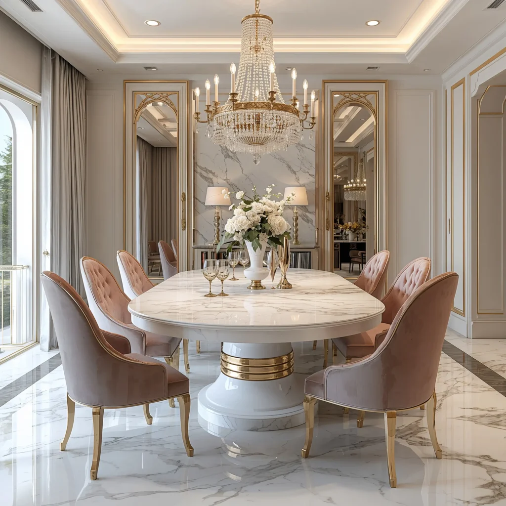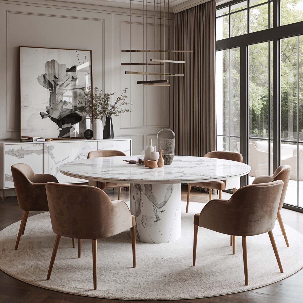 Can we talk about how round marble tables just hit different? They create this instant intimacy that rectangular tables can’t touch. Throw in some plush velvet chairs, and you’ve got a dining space that practically begs for long dinner conversations.