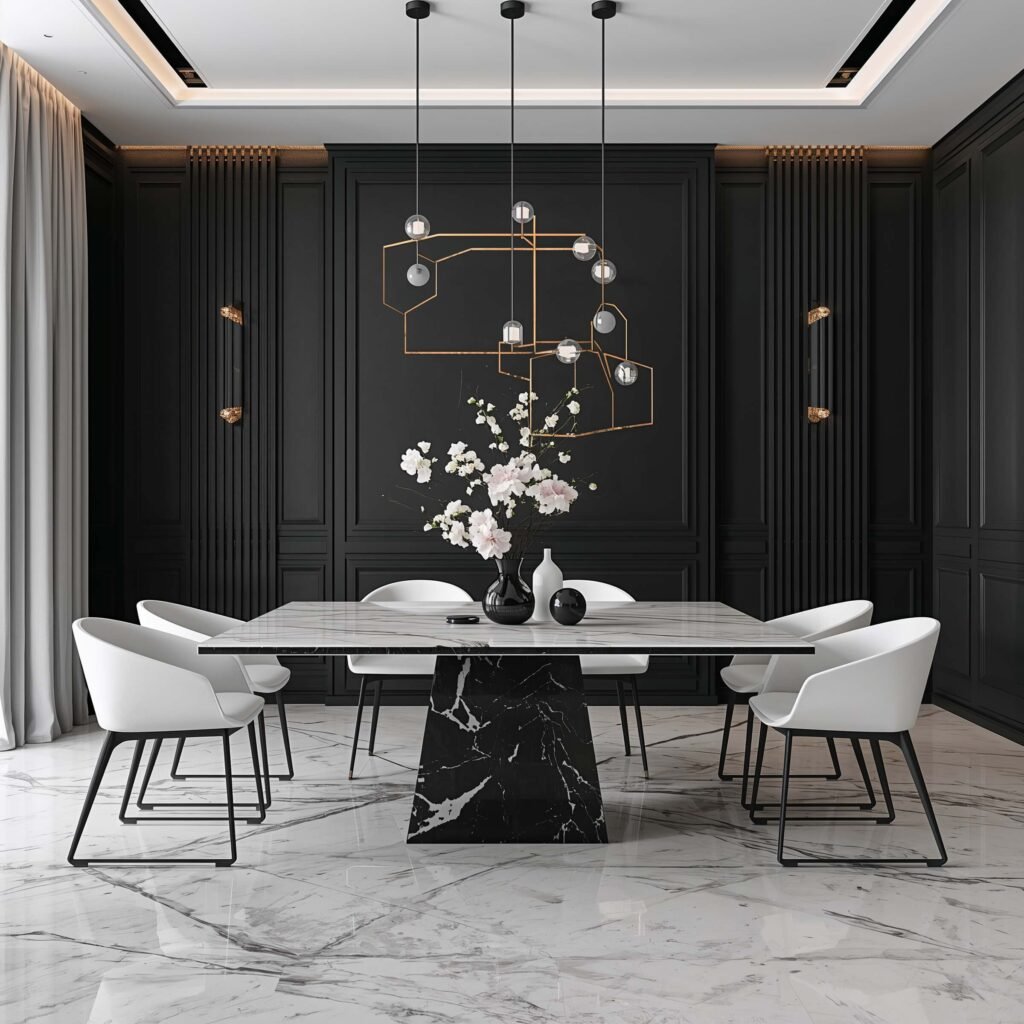 I went full monochrome in my own dining room last year—black marble table with white veining, white walls, black chairs. The effect? Stunning, if I do say so myself. Every meal feels like fine dining, even when it’s just leftover pizza.