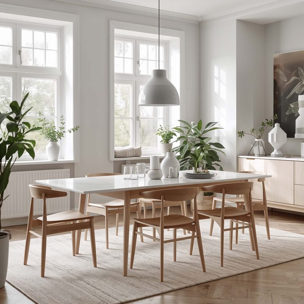 Last but definitely not least, let’s explore Scandinavian marble dining rooms—where hygge meets high-end. This style masters the art of cozy sophistication, making marble feel warm and inviting rather than cold and formal.