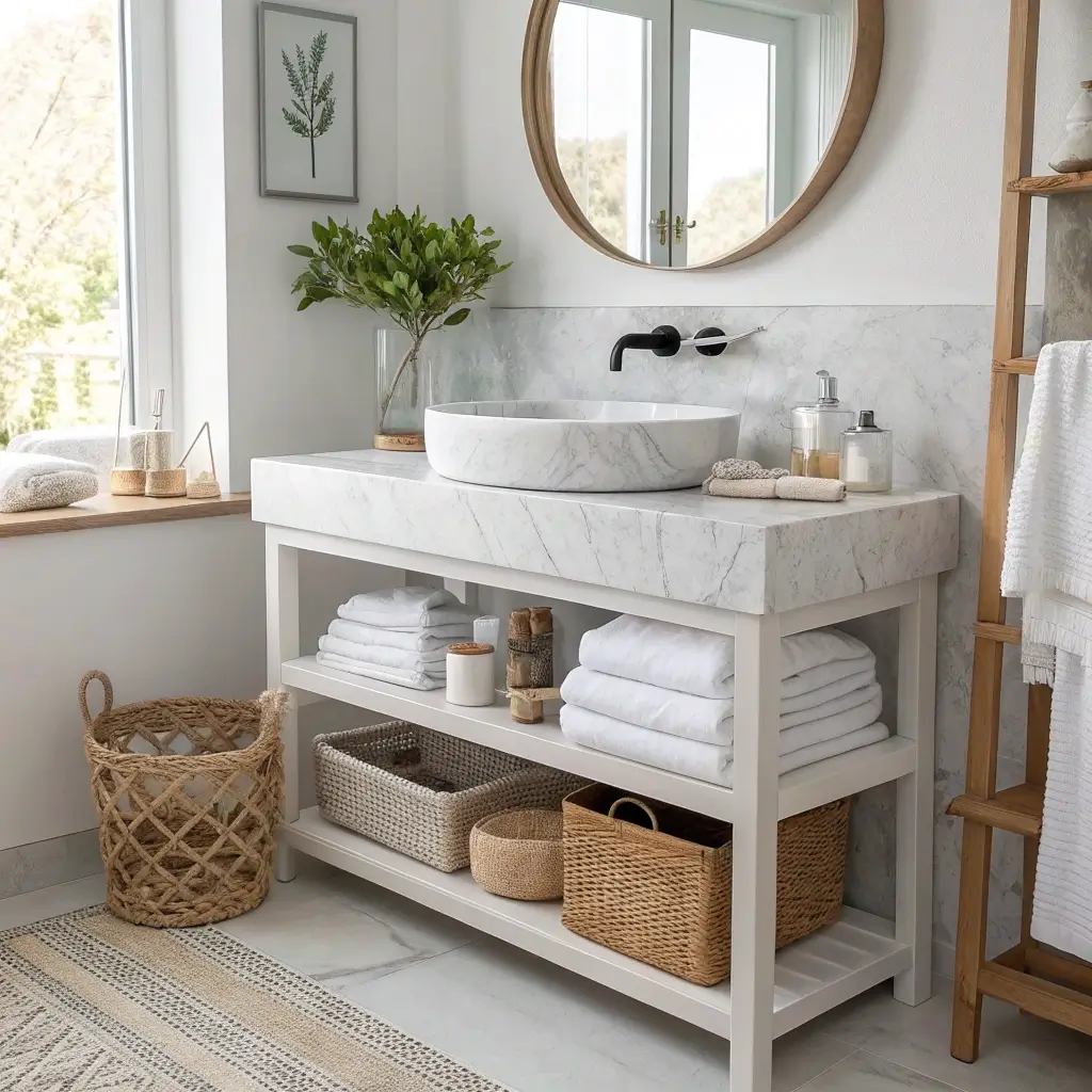 The best part? You can change the look seasonally. Switch out basket colors, swap towel shades, add holiday touches. Your marble sink stays classic while everything below can evolve.