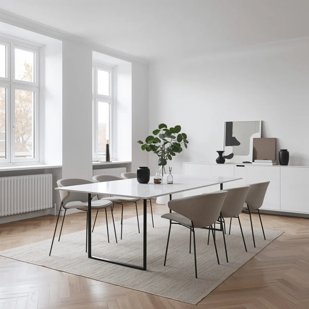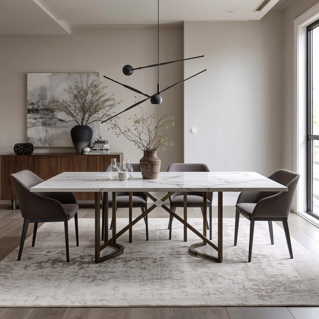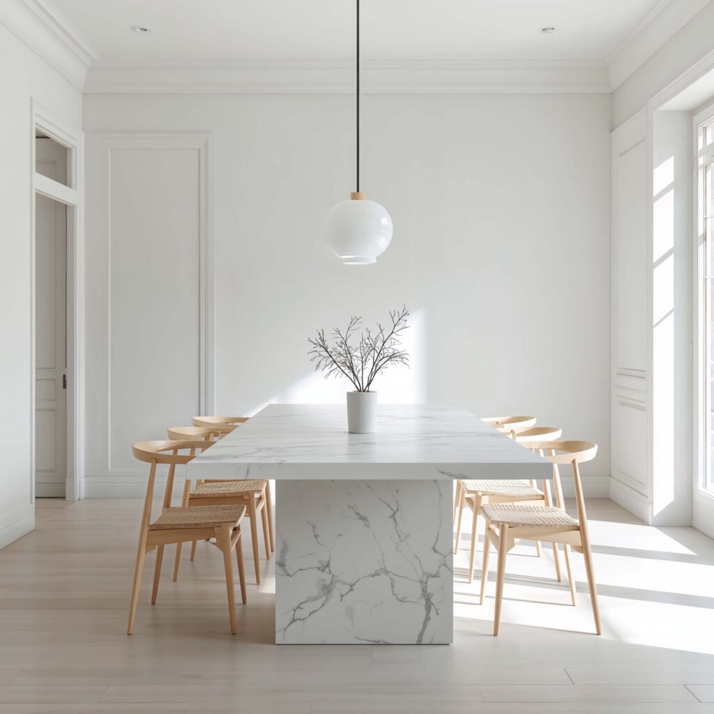 Here’s what nobody tells you about minimalist marble tables: they’re surprisingly versatile. You can dress them up with fancy placemats for dinner parties or keep them bare for everyday use. The marble itself provides all the texture and interest you need.