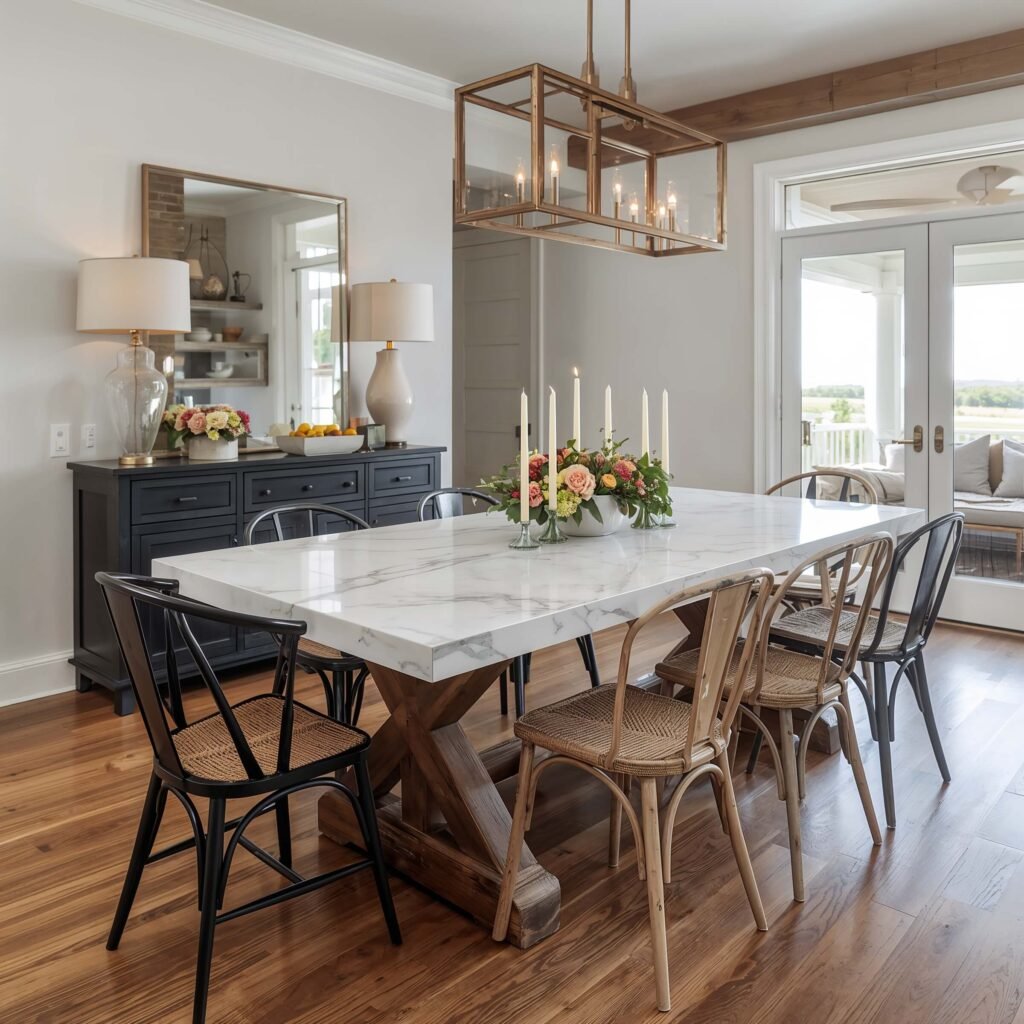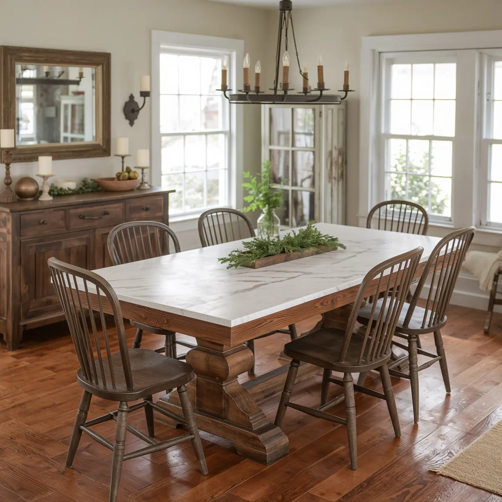 Here’s where people mess up: they go too rustic or too fancy, creating a confused identity crisis in their dining room. Balance is everything. If your base screams “I was hand-hewn by pioneers,” let your marble whisper “but we’ve upgraded since then.”