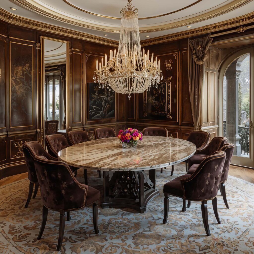 Sometimes you need to go full glamour, and I respect that. Pairing marble tables with crystal chandeliers creates an ambiance that makes every meal feel like a special occasion. Even when it’s just leftover pizza on a Tuesday.