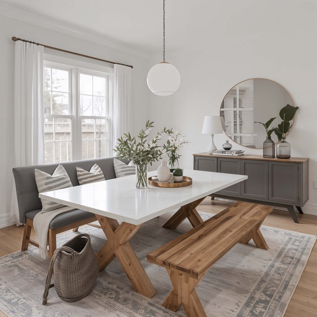 The wood finish matters more than you’d think. High-gloss poly makes the combination feel formal, while natural oil finishes keep things casual and organic. Choose based on how fancy your average Tuesday night dinner is.