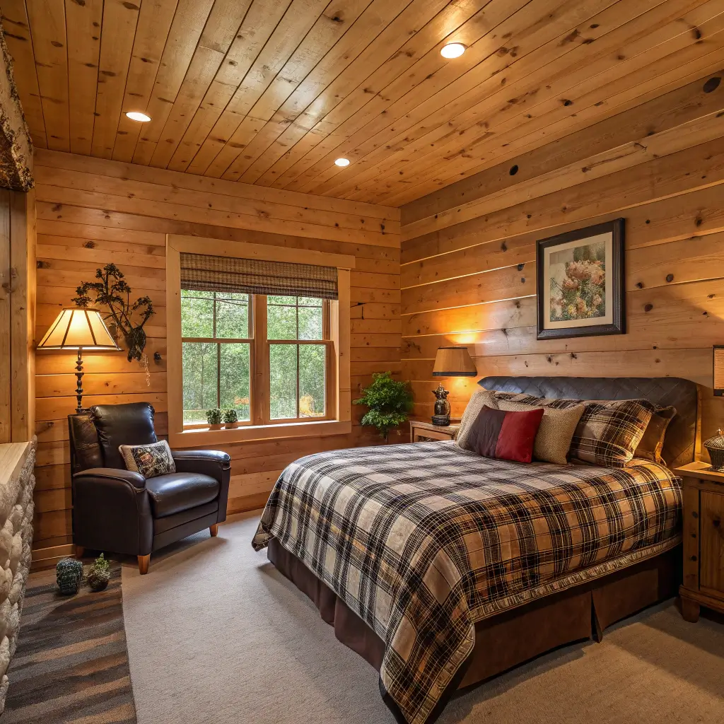 Real or faux, wood paneling on one accent wall instantly sets the mood. Pine, cedar, or reclaimed barn wood – each brings its own character. Pair this with a solid wood bed frame (bonus points for live edge headboards) and you’re halfway to that cabin aesthetic.