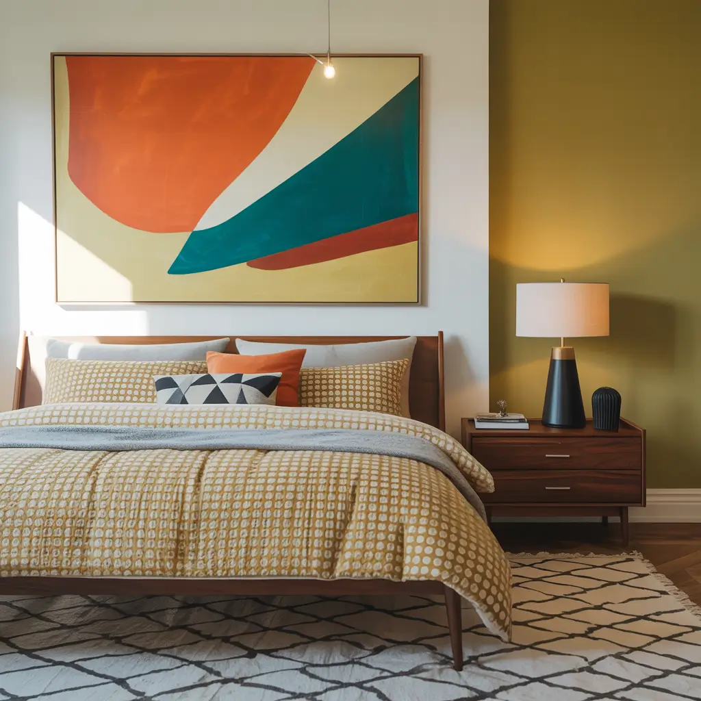 Art in a midcentury bedroom isn’t just decoration – it’s the punctuation mark that completes your design sentence. The right piece can tie together colors, add personality, and give guests something to talk about besides your impressive nightstand styling.