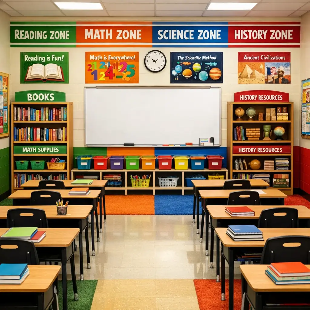 Start by mapping out your classroom’s natural divisions. Most rooms have corners, alcoves, or wall sections that lend themselves to specific purposes. Then assign each area its own color personality: