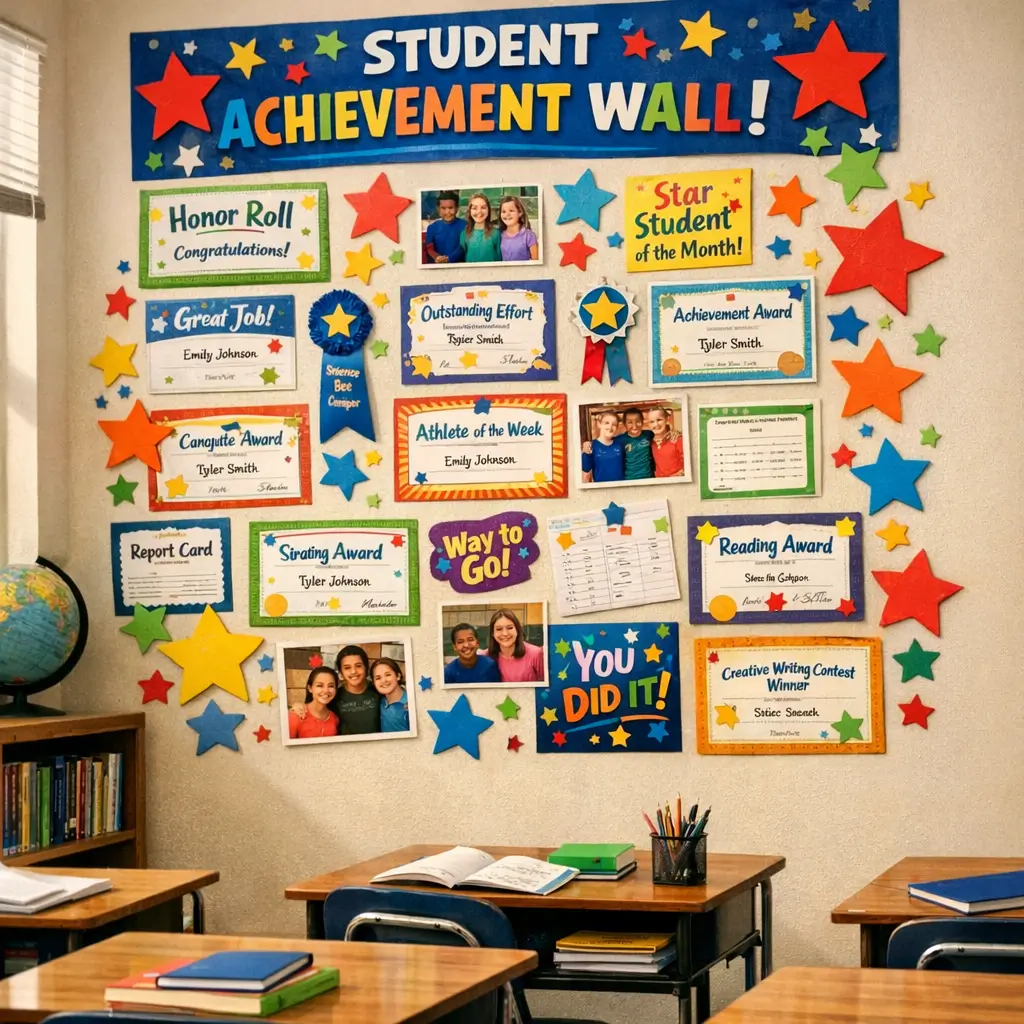 I use a combination of a physical wall display and a digital slideshow that rotates on a screen. The physical wall features removable frames where we showcase different achievements weekly. Students actually compete to get their work displayed, but since we have so many categories, everyone gets their moment eventually.
