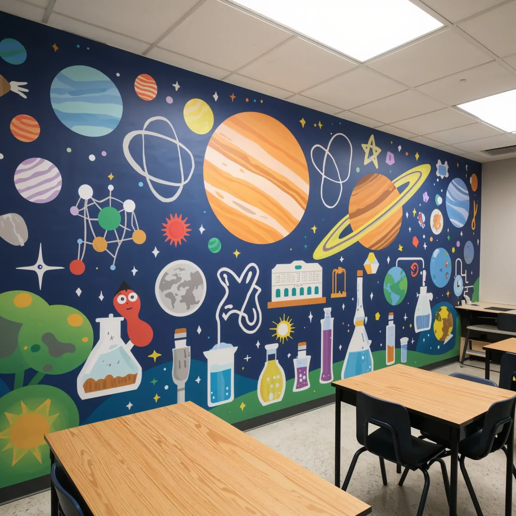 Want to make a serious impact? Commission (or create) a wall mural that actually teaches something. I’m not talking about random pretty pictures – I mean educational art that becomes a reference point throughout the year.