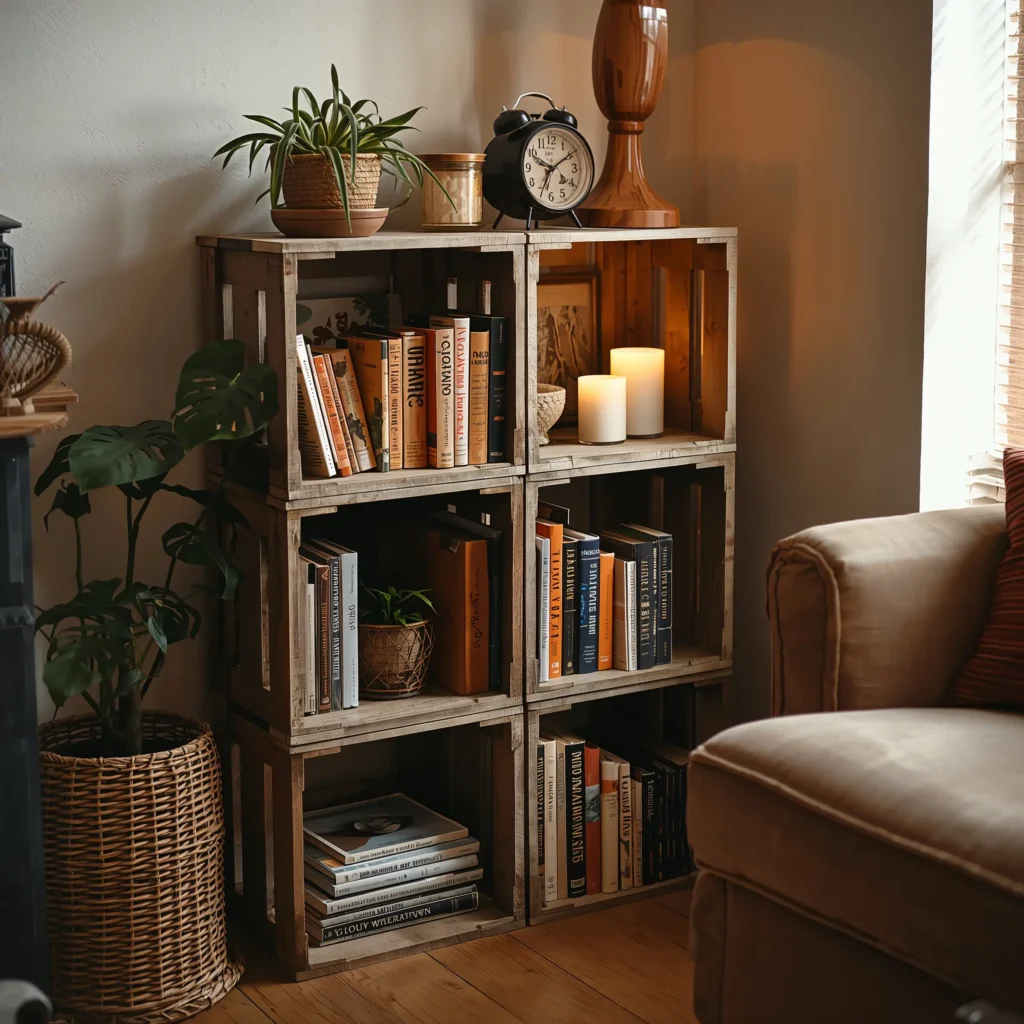 Nothing beats the character of repurposed vintage crates. I started collecting wooden fruit crates from flea markets, and now my entire bedroom wall showcases books in these rustic beauties. Each crate tells its own story while holding mine.