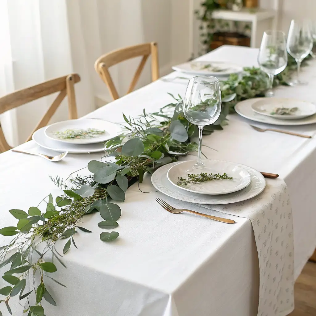 Here’s what makes this combo absolutely unbeatable: white linen creates this perfect blank canvas that makes everything else pop. You lay down that pristine white tablecloth, maybe add a subtle white runner if you’re feeling fancy, and then strategically place eucalyptus garlands or olive branches down the center. The contrast between the soft white and the organic green creates this natural flow that feels both intentional and effortless.